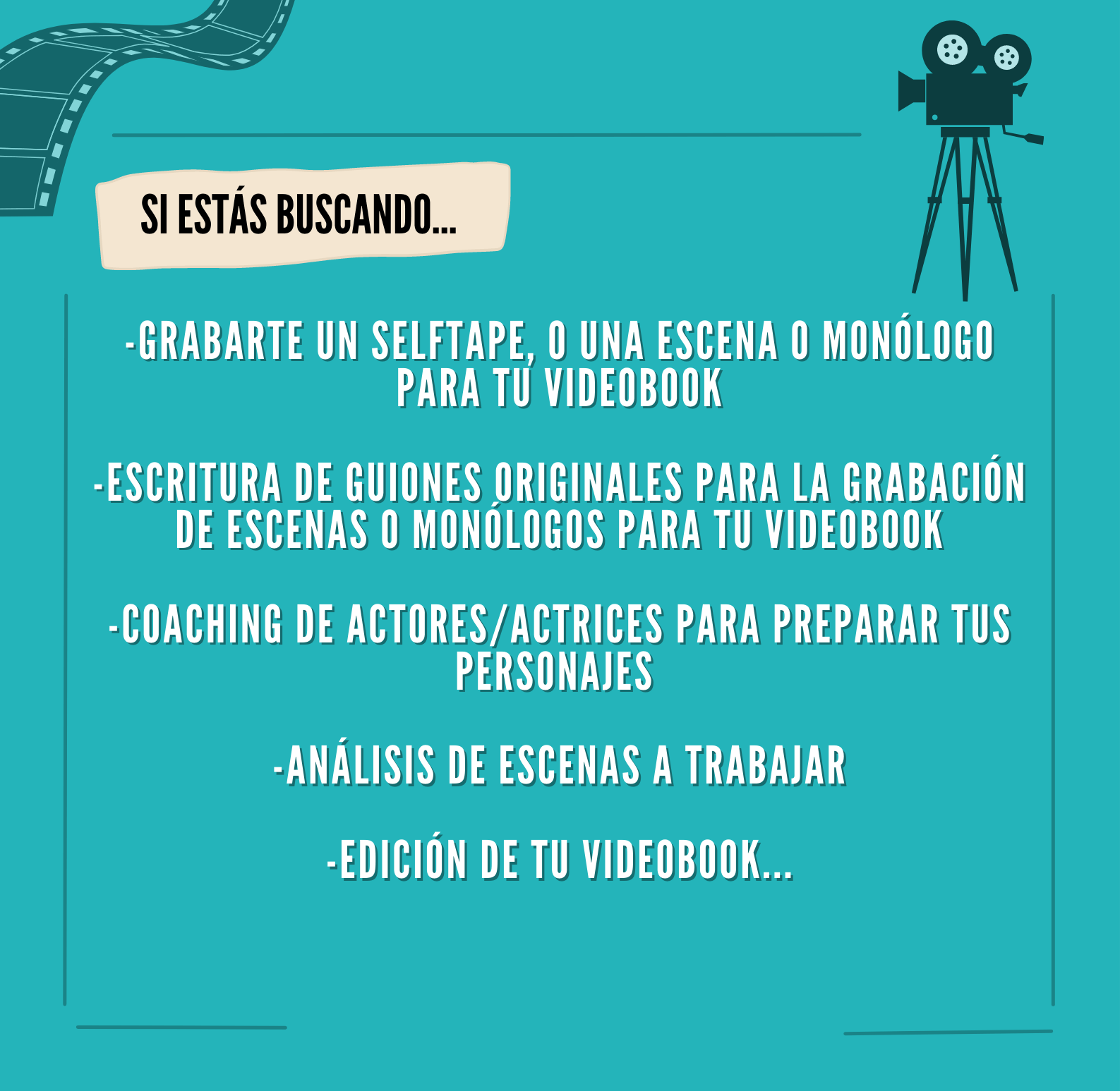 ¿Eres actor o actriz y necesitas grabarte una escena para tu videobook, edición del mismo, un coaching actoral o un selftape? Contacta a través de la pestaña 'Servicios' de esta web o de mi instagram @raquelburbanoaudiovisual.